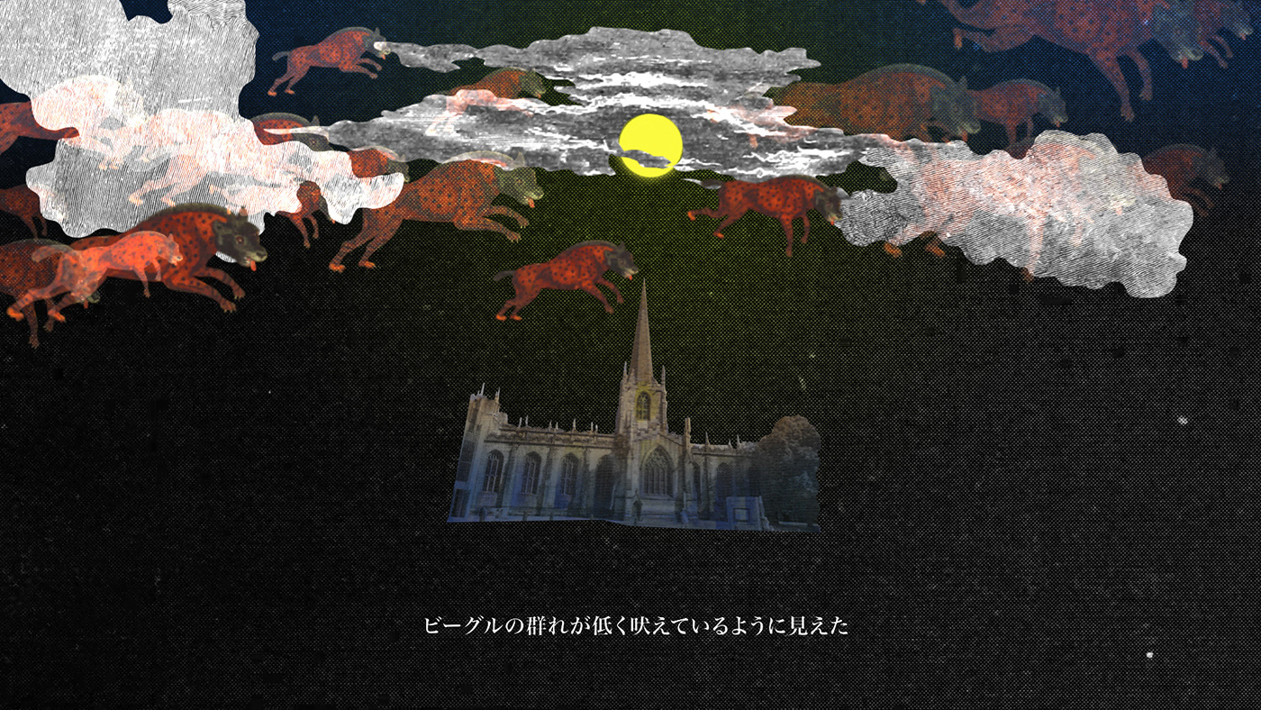 That Long Moonless Chase / その長い月のない追跡 は、イギリスのシェフィールドと日本の京都に伝わる二つの民話をベースに、不吉なフォークホラーと幻想的な神話のイメージをマッシュアップしたパフォーマンスである。アニメーション作家の尾角典子と作曲家・パフォーマーのHelen Papaioannouのコラボレーションで、ミクストメディアのアニメーションとエレクトロニクス、ボイスレコーディング、バリトンサックスを中心としたライブ音楽、Başar Ünderのサウンドデザインサンプルがベースになっています。この作品は、シェフィールドの「ガブリエル・ハウンド」と京都の「水吹き銀杏」という二つの古い民話のテキストを使い、これらの都市で起こった歴史的な出来事と、世代や文化を超えた語りのプロセスに焦点を合わせています。 日本語と英語のテキストがオンライン翻訳エンジンを通してループすることで、物語間のやり取りが仲介され、様々な翻訳の繰り返しに基づいて伝説が奇妙で壮大な新しい神話に歪められる。 その過程で、イメージ(表現)と言語(意味)の間のリンクが崩れ、これらのシンボルは視覚と聴覚の両方で意味的な意味を失います。
