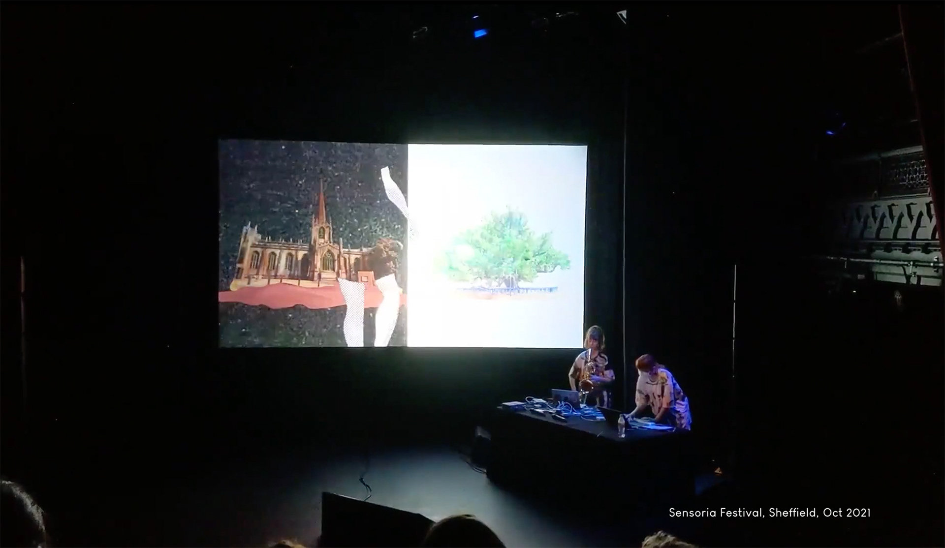 'The performance of That Long Moonless Chase / その長い月のない追跡 is a mash up sinister folk horror and fantastic mythological imagery based on two folk tales passed down in Sheffield, UK and Kyoto, Japan. A collaboration between animator Noriko Okaku and composer & performer Helen Papaioannou, the performance is based on mixed media animation and live music based around electronics, voice recordings & baritone saxophone, including sound design samples by Başar Ünder. The piece uses two old folk tale texts, the Gabriel Hounds in Sheffield and the water weeping Gingko Tree in Kyoto, and focuses on historical events that took place in these cities and the processes of storytelling both across generations and cultures. The exchange between the tales is mediated by the looping of the Japanese and English texts through online translation engines, warping the legends into a bizarre and spectacular new mythology based around the various translation iterations. In the process, the link between image (representation) and language (meaning) is broken down, as these symbols lose their semantic meaning, both in sight and sound.